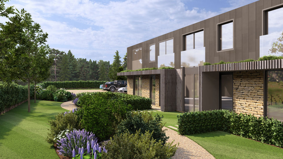 - Outdoor Living: Private gardens, communal green spaces, and a green roof-covered porch with external lighting.